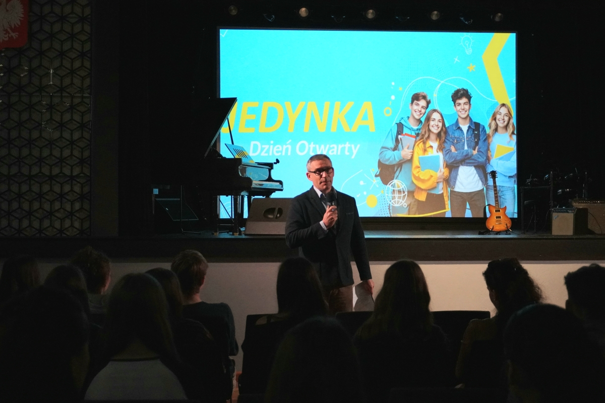 Dzień Otwarty rozpoczął się w auli występem szkolnego zespołu muzycznego Only One. Gości powitał dyrektor Marcin Kopczyński oraz przedstawicielka Samorządu Uczniowskiego Hanna Pilśniak. Uczestnicy mieli również okazję zapoznać się z prezentacją firmy PREVAC – partnera szkoły wspierającego rozwój edukacyjny uczniów.