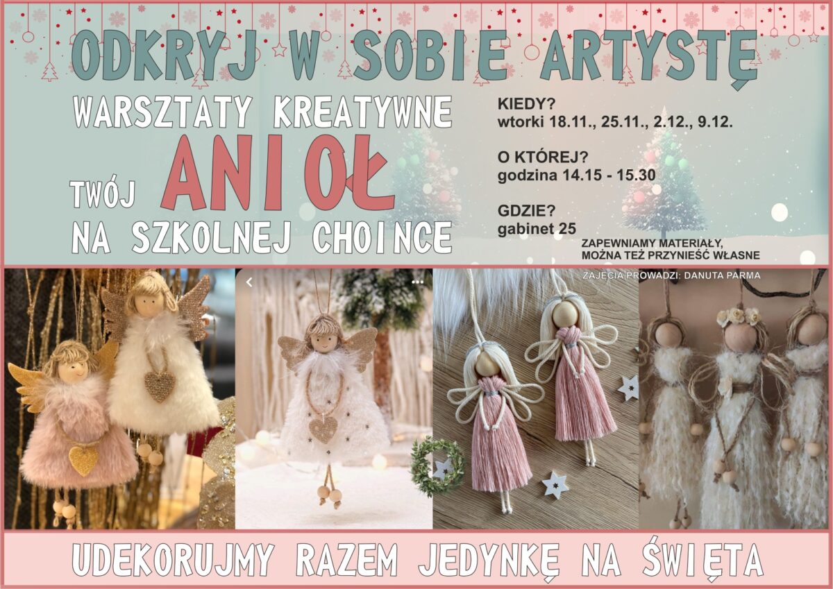 Twój anioł na szkolnej choince – ruszają warsztaty kreatywne ODKRYJ W SOBIE ARTYSTĘ. Spotykamy się we wtorki: 18.11, 25.11, 2.12, 9.12 w godzinach 14.15 – 15.30, w gabinecie 25. Materiały do wykonania aniołków zapewnione, można też przynieść własne.
