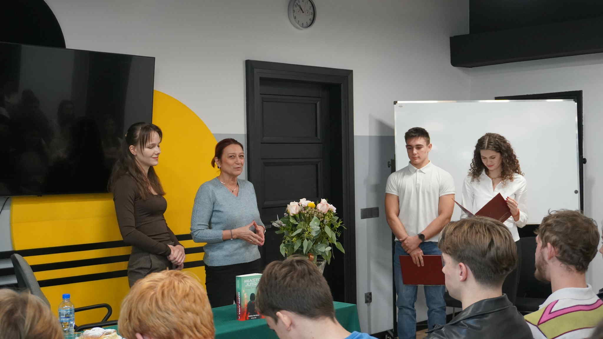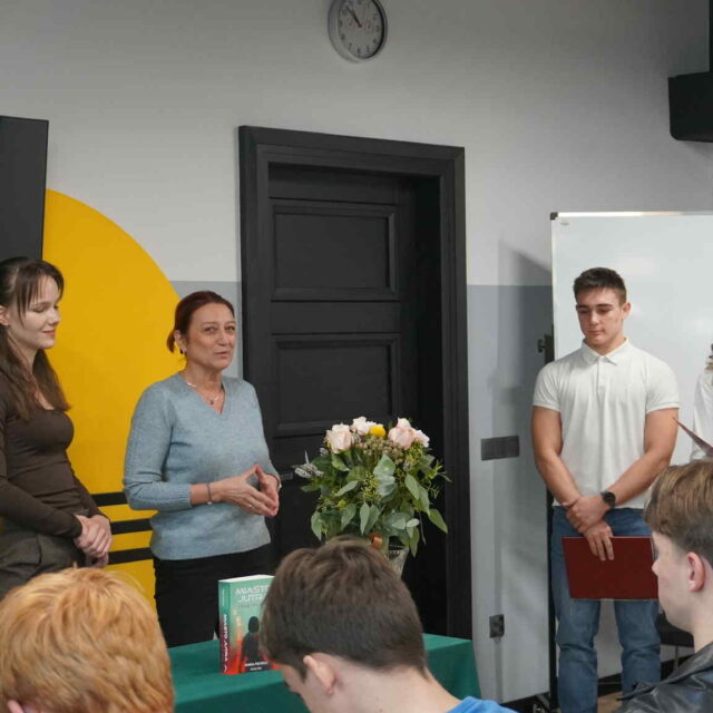 Monika Przybyła, absolwentka Jedynki i Śląskiego Uniwersytetu Medycznego na kierunku lekarskim, opowiedziała o swojej drodze zawodowej, wyborze studiów i specjalizacji (okulistyka) oraz debiucie literackim – książce, która przenosi czytelnika w niedaleką przyszłość: w dystopijny świat zdominowany przez sztuczną inteligencję, gdzie człowiek poddawany jest próbom i staje przed koniecznością dokonywania trudnych wyborów.