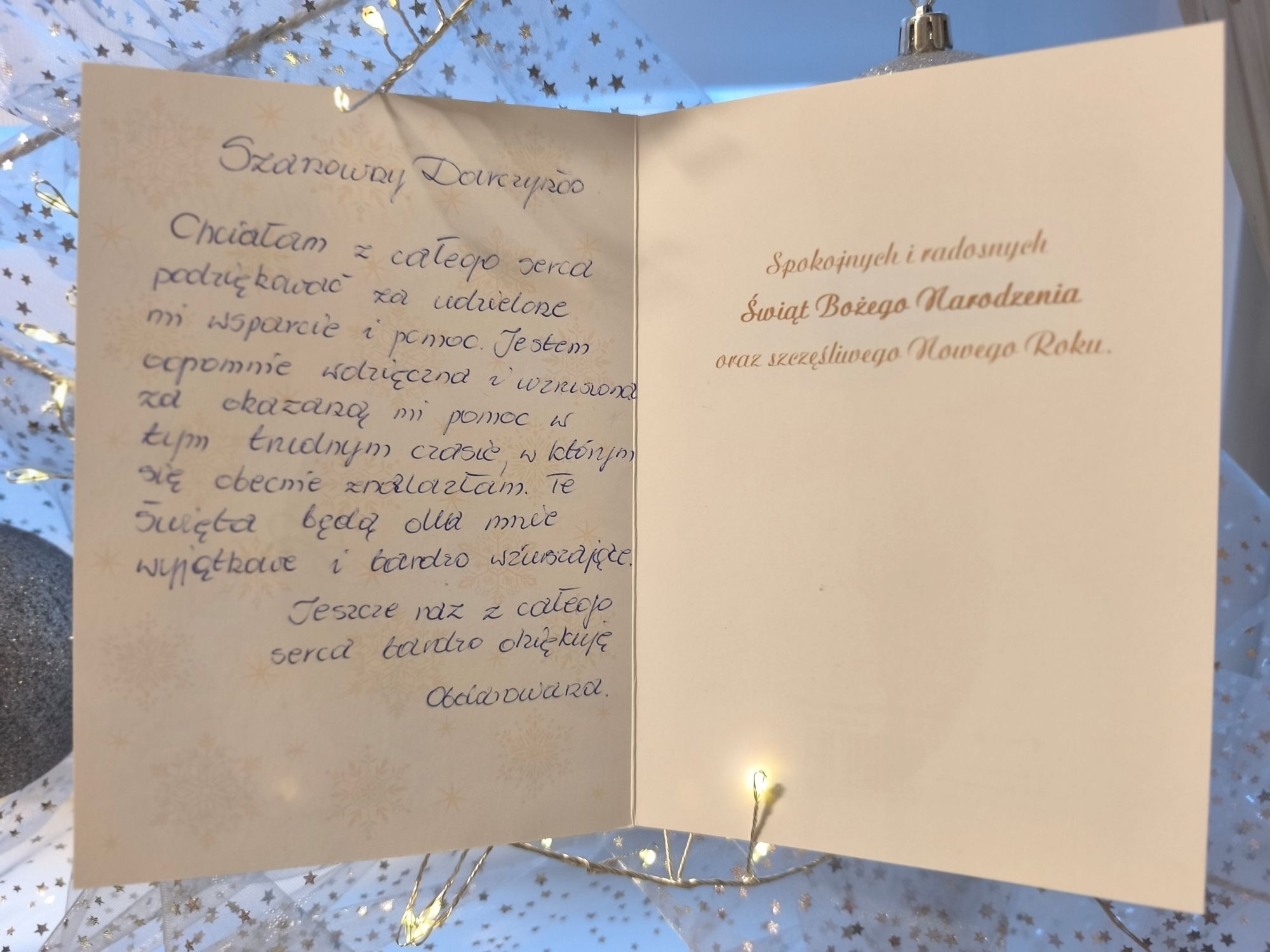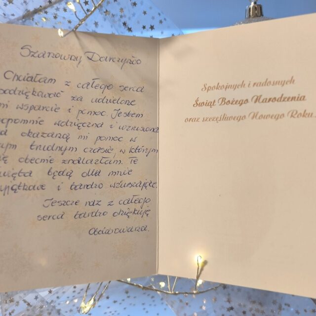 Tym razem pomagaliśmy Pani Halinie mieszkającej samotnie ze swoimi zwierzętami. Jest ona osobą schorowaną, a kilka miesięcy temu straciła pracę. Pani Halina w ramach wdzięczności przekazała nam za pośrednictwem wolontariuszy upieczone przez nią ciasteczka oraz kartkę z podziękowaniami i życzeniami.