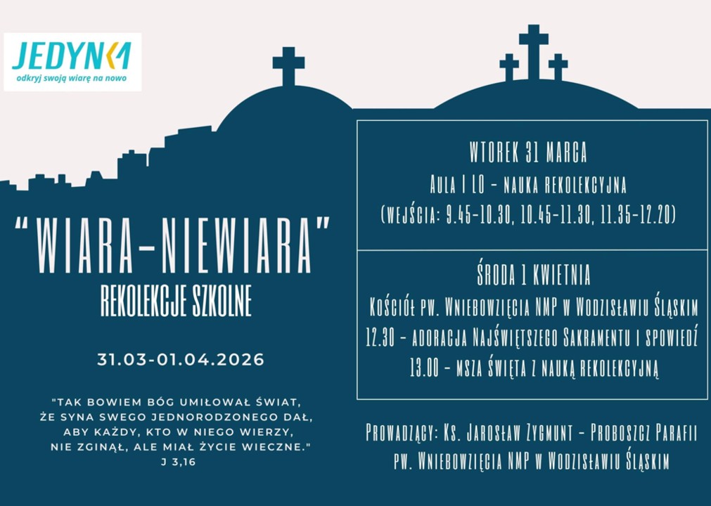 Zapraszamy do udziału w szkolnych rekolekcjach, które odbędą się w Wielki Wtorek 31 marca oraz w Wielką Środę 1 kwietnia.