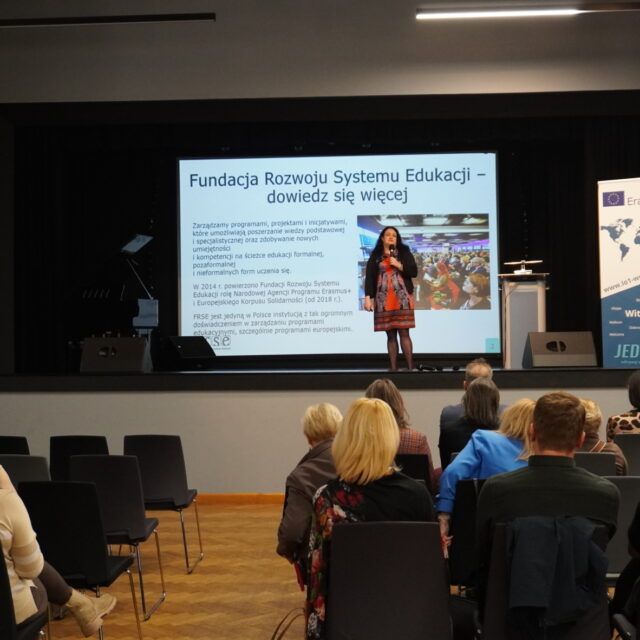 Pierwsza prelekcja, wygłoszona przez Alinę Prochasek z Fundacji Rozwoju Systemu Edukacji, dotyczyła nowych możliwości i perspektyw, jakie oferuje program Erasmus+, a także roli projektów w kształtowaniu kompetencji przyszłości. Następnie głos zabrała Marta Iwańska reprezentująca Erasmus+ InnHUB Katowice, która zaprezentowała dobre praktyki w realizacji projektów Erasmus+ w oparciu o priorytety programu, wskazując na przykłady udanych działań szkół z regionu. Po krótkiej przerwie na kawę i networking uczestnicy mieli okazję odwiedzić stanowiska informacyjne przygotowane przez szkoły realizujące projekty w sektorach Edukacja szkolna i Kształcenie i szkolenie zawodowe, by wymienić się doświadczeniami i nawiązać nowe kontakty.